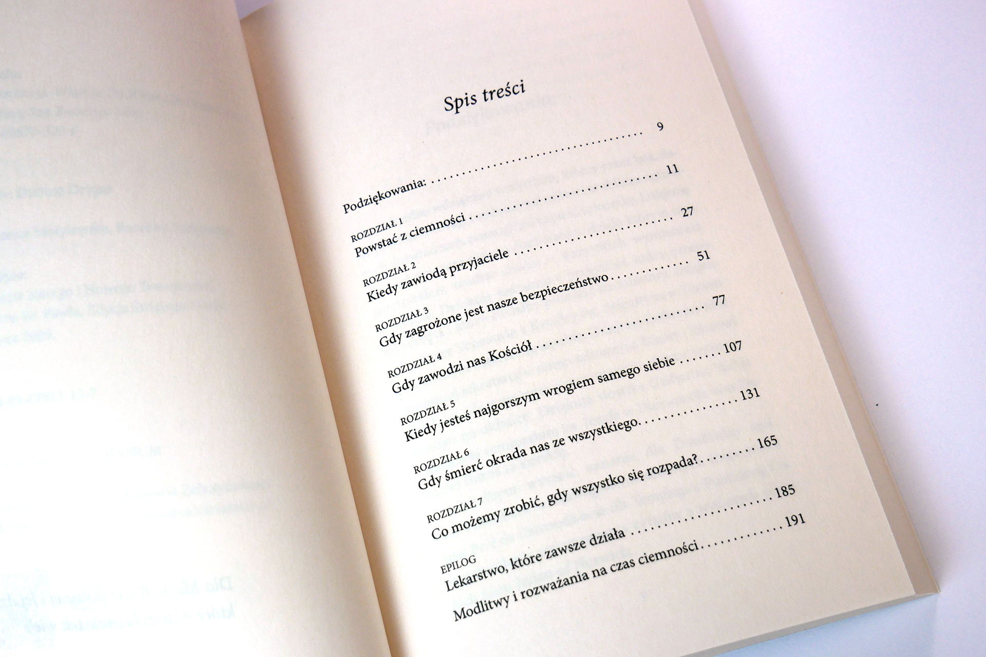 Ta książka nie jest odpowiedzią, ale przewodnikiem dla pozostających w ciemności. Jest o podążaniu pomimo ciemności, o przetrwaniu i wykorzystaniu nieuniknionego czasu życiowych ciemności do tego, aby wzrastać.